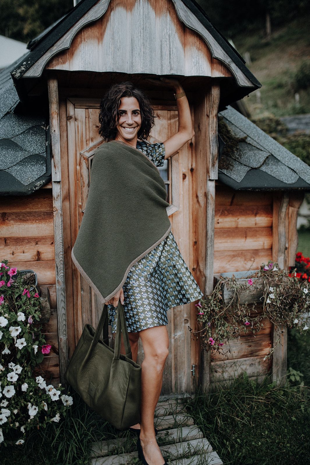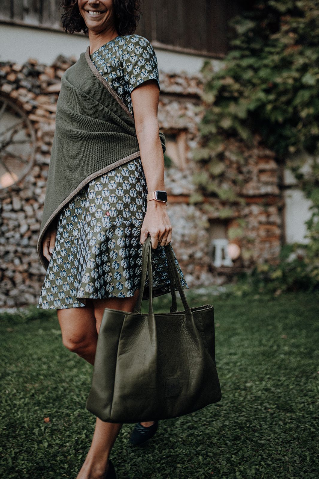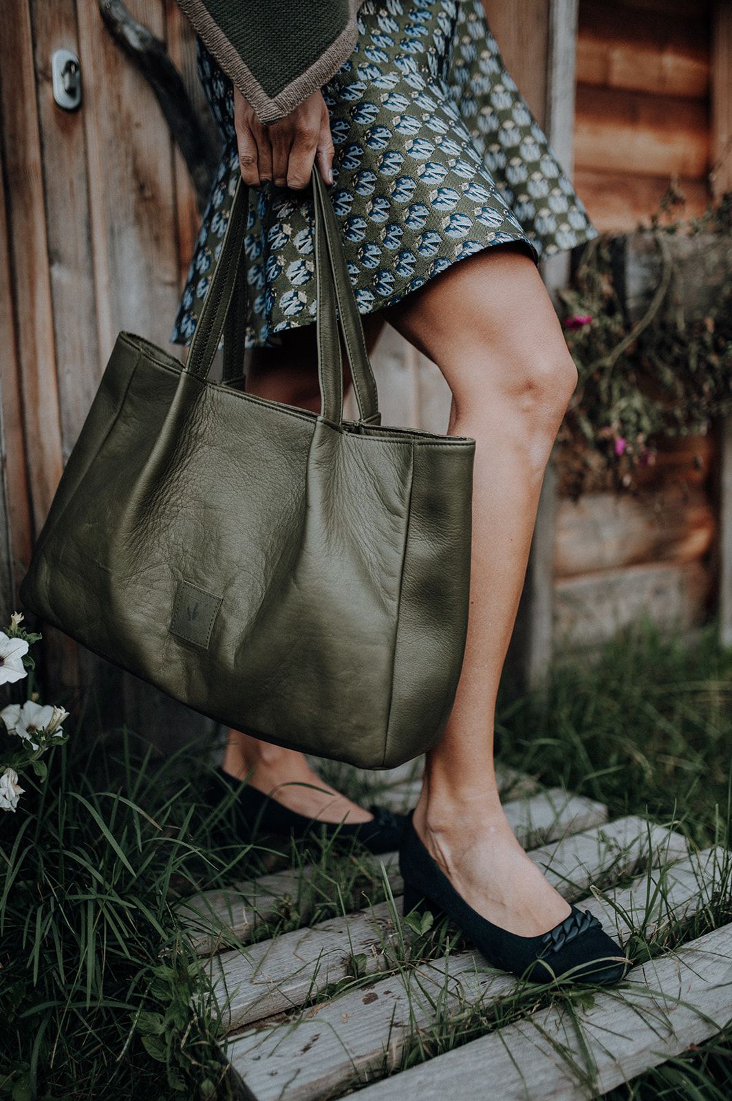 Leder Handtasche in schönem Tannengrün aus Rindsleder. Innenfutter aus gemusterte Baumwolle.
