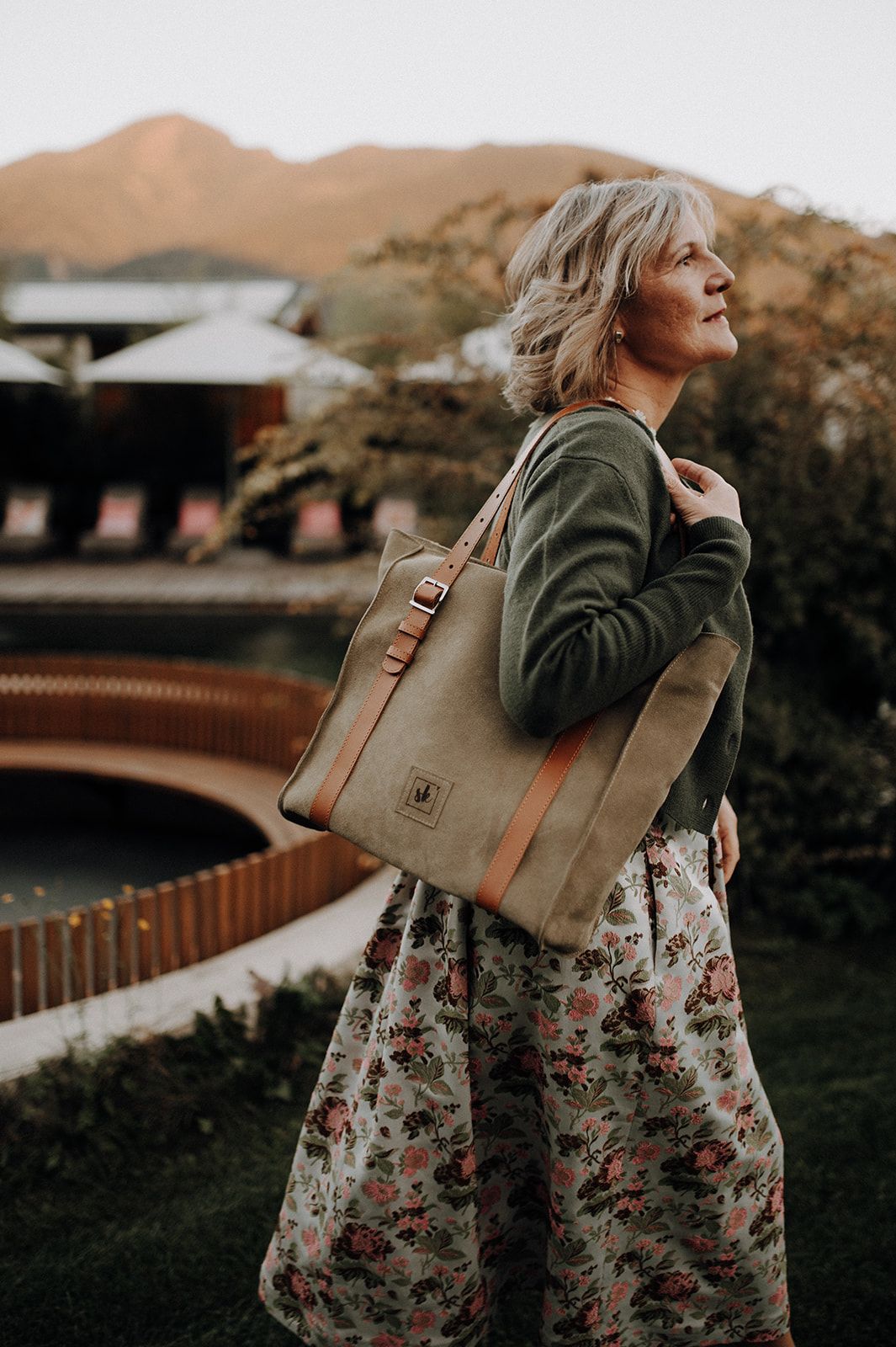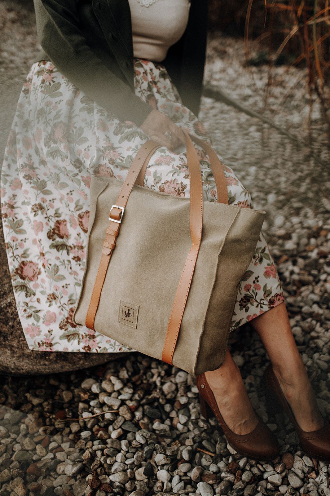 Veloursleder Shopper mit Glattleder Riemen mit Verstelbare Option. Reissverschluss, Innen mit gemusterte Baumwolle und innentasche gestaltet.
