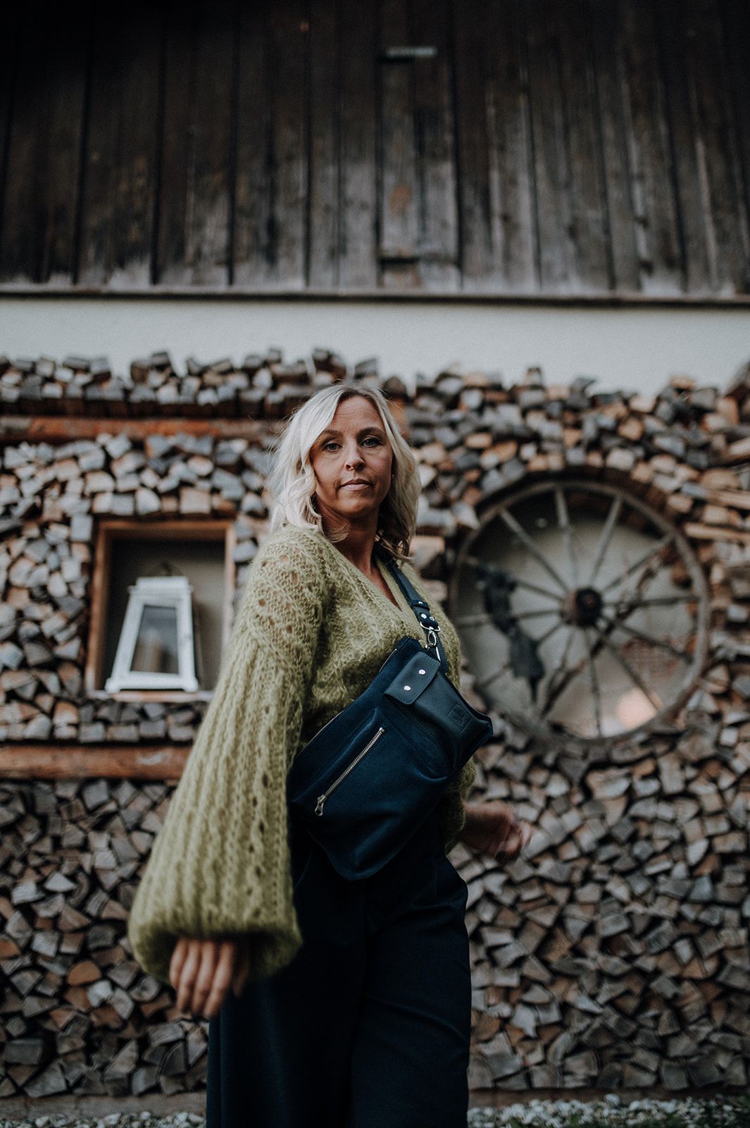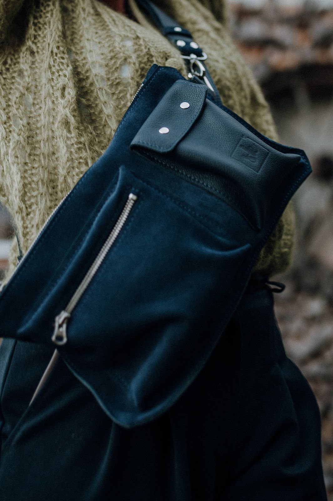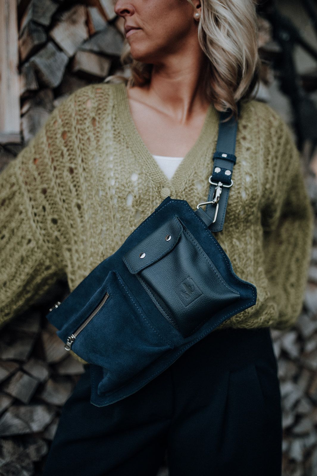 Aus Velour uund Glattleder in dunklem blau, Zwei Aussentaschen. Verstelbarer Riemen.